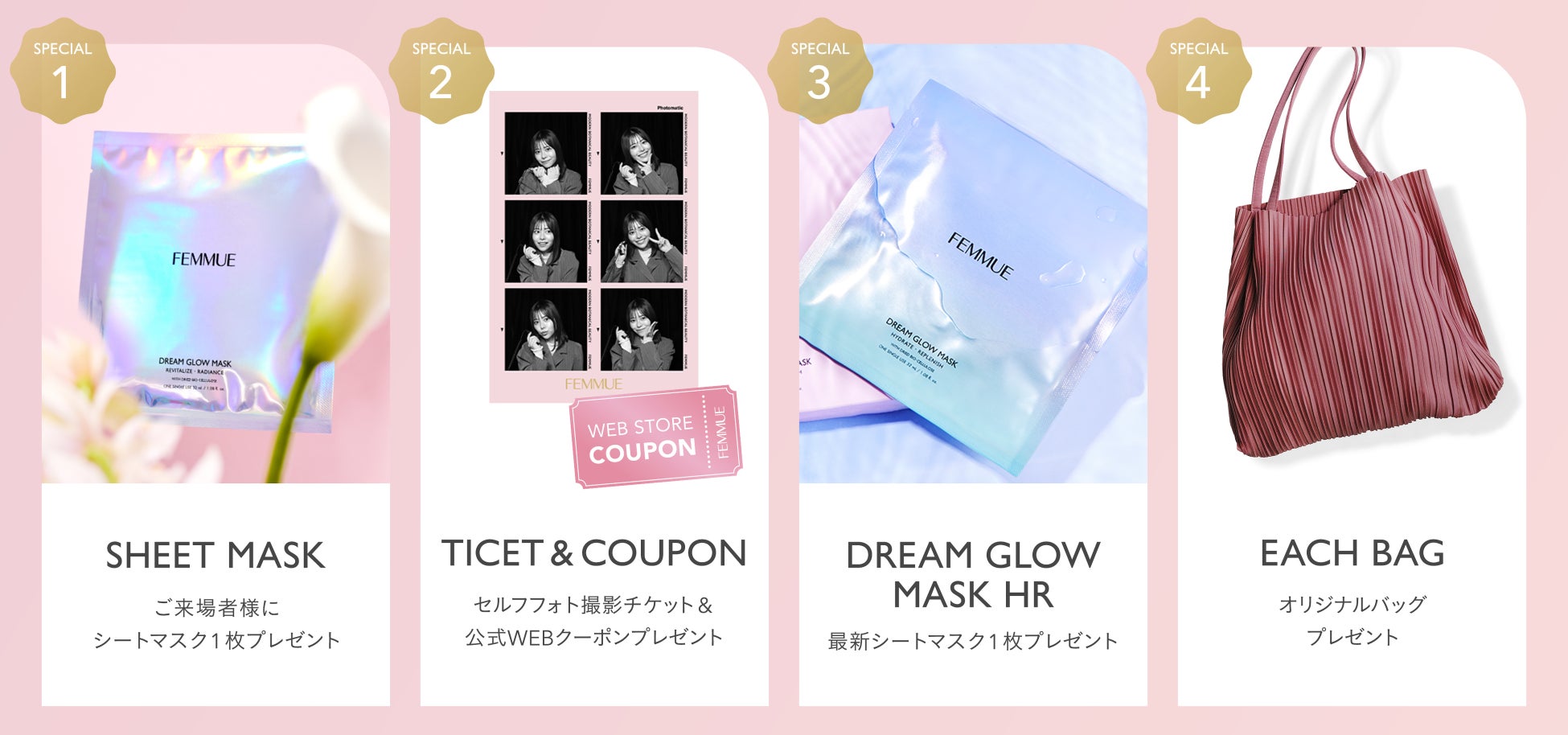 製品をご購入いただいた方には、セルフフォト撮影チケット、FEMMUE公式オンラインストアで利用できるクーポン、税込4,400円以上で「ドリームグロウマスク(HR)」、税込8,800円以上で、FEMMUEオリジナルバックなどスペシャルな特典をご用意しています。