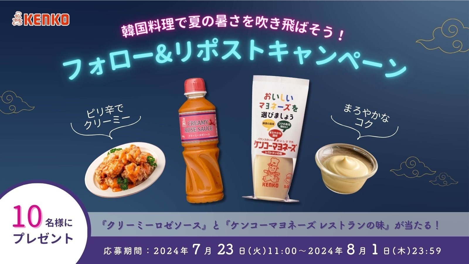 ケンコーマヨネーズ株式会社は、当社公式X(@kenko_mayo)をフォロー&リポストすると、韓国料理に使えるソースとマヨネーズが当たるキャンペーンを本日7月23日(火)から8月1日(木)まで実施します。