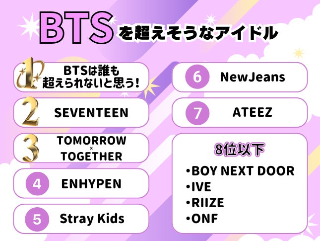 この先、💜BTS💜を超えそうなアイドルは?の調査で1位に選ばれたのは全体の約半分の47.5%の38票獲得で【BTS】でした!