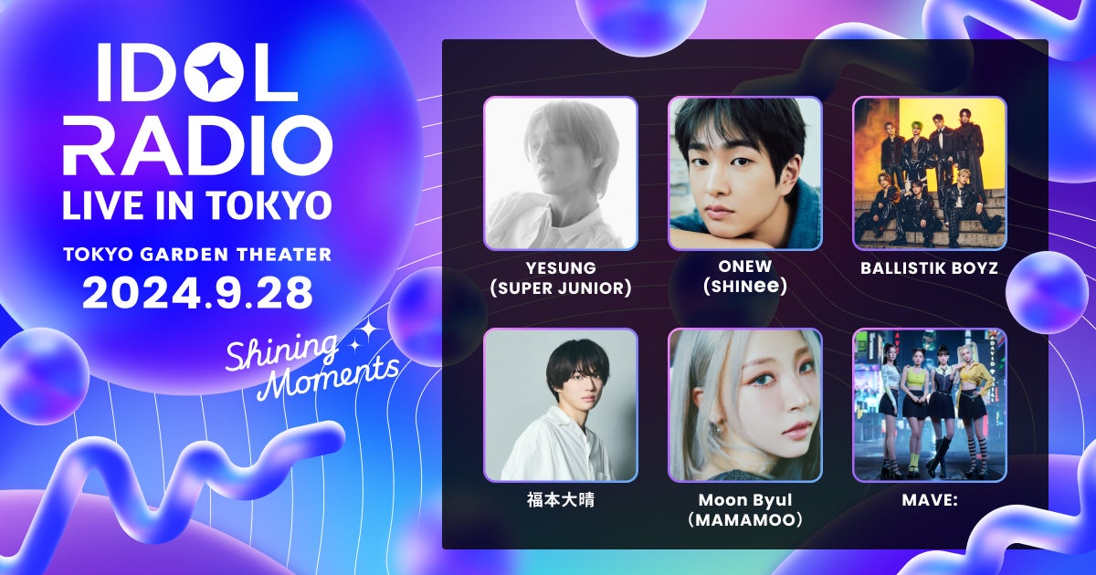 株式会社 mediba、株式会社 K Tomo、株式会社ロイヤリティ マーケティングは、「IDOL RADIO LIVE IN TOKYO 〜Shining Moments〜」を、2024年9月28日(土)に東京ガーデンシアターで共同開催いたします。その第1弾ラインアップとして、YESUNG(SUPER JUNIOR)、ONEW(SHINee)、BALLISTIK BOYZ from EXILE TRIBE、福本大晴、Moon Byul(MAMAMOO)、MAVE:の出演が決定しました。