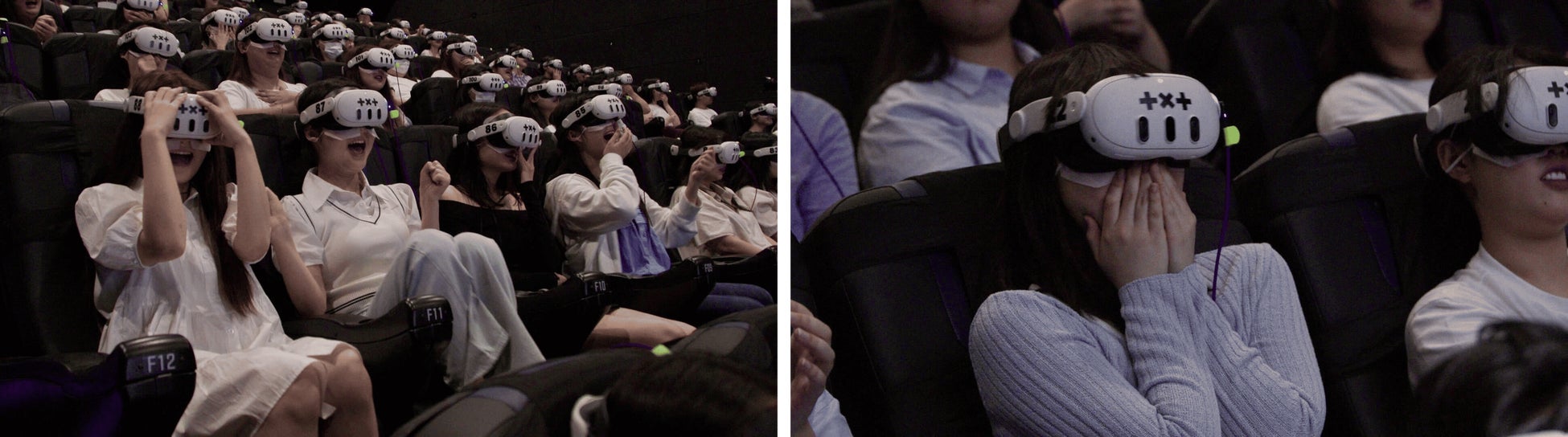 観客は映画館でVRヘッドセットを着用し、目の前に広がる12Kの高精細な映像と5.1chサラウンドシステムによる高品質な音響環境で臨場感あふれるVRコンサートを鑑賞することができます。ヘッドセットが手を認識するため、観客は自身の手で操作をしながら好きな角度や位置からVRコンサートを鑑賞することが可能です。メンバーたちの圧倒的なビジュアルとパフォーマンスを、まるで手が届くかのような”最前列以上の近さ”で観られることに加えて、メンバーたちが自分の目を見つめながら歌ってくれる特別な没入体験も味わうことができるのも魅力です。本作品のVFXスーパーバイザーを務めたキム・ホンチャン監督による「カメラをファンだと思って気持ちを通わせ、コミュニケーションするように」というディレクションに見事に応えた、VRコンサートだからこそ味わえるメンバーたちの表現も見どころです。
