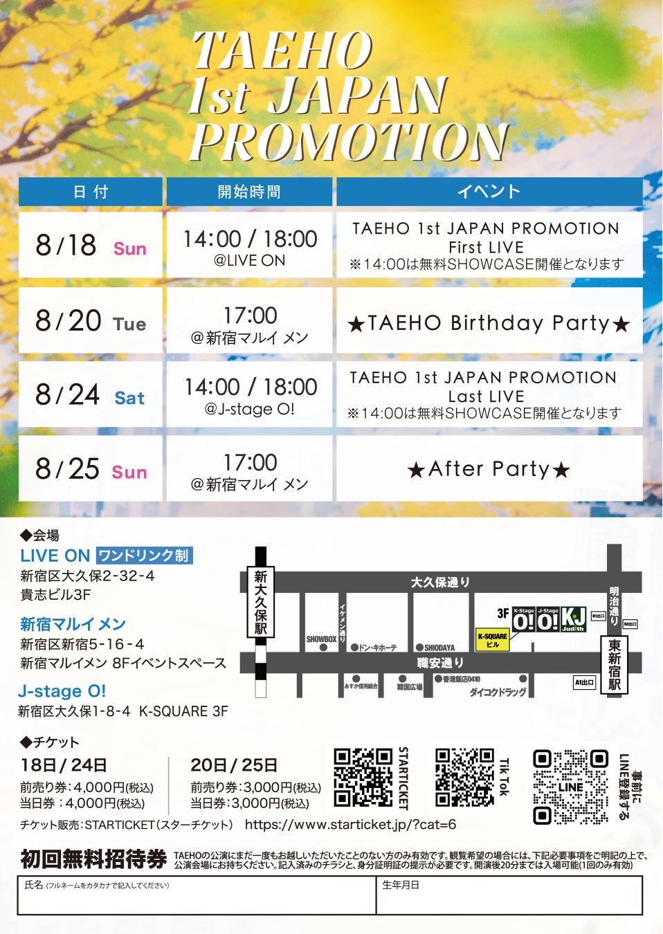 2022年より韓国グループAMBITIONのラッパーとして活躍、高いダンススキルとクールで男らしいステージの魅力に加えて、愛嬌ある癒し系キャラとしての部分も垣間見せるギャップでファンを魅了するテホ。今回は初のソロ来日ということで、2回の無料ショーケースをご用意している。