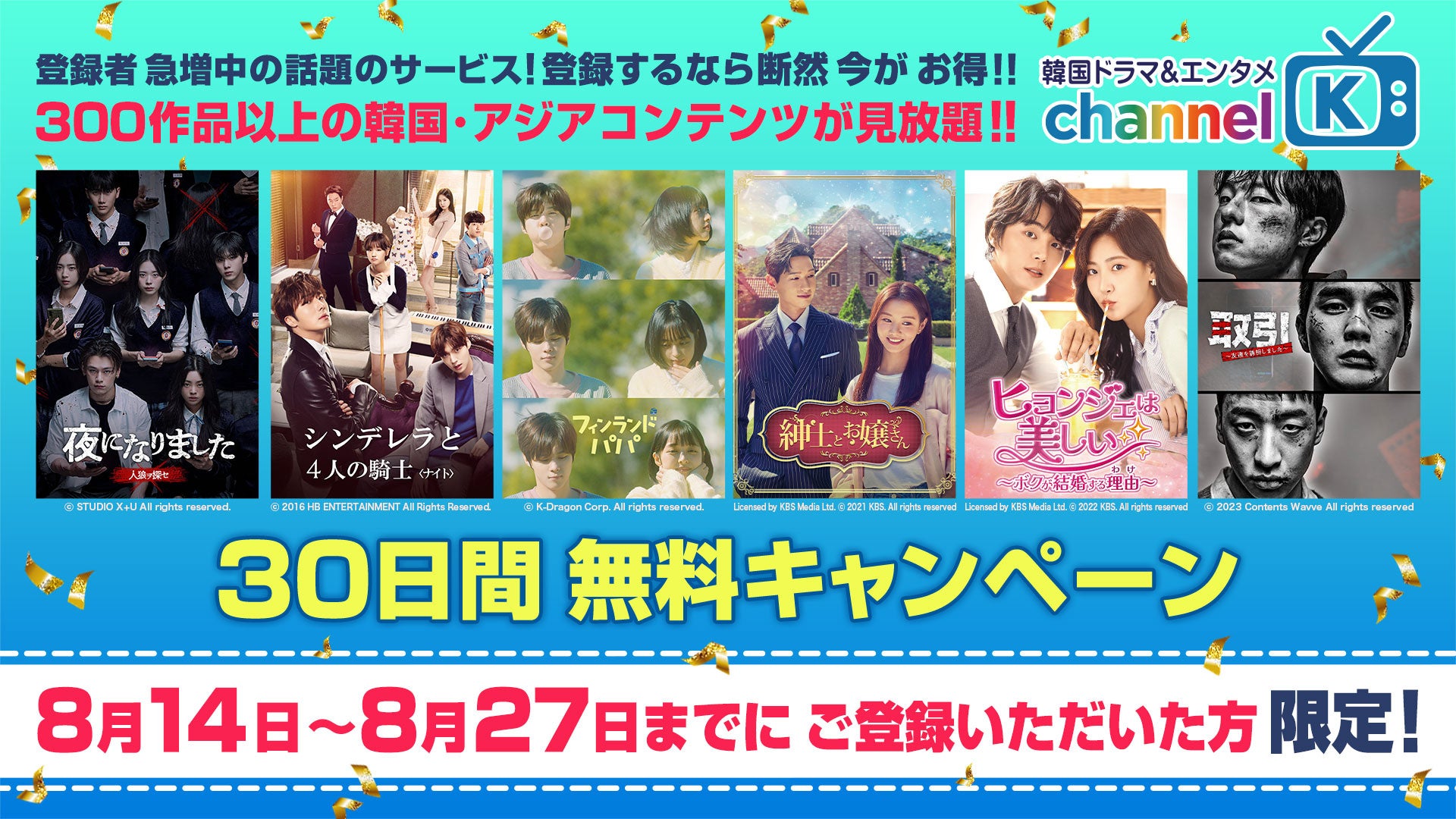 しかしなんとこの度、韓国ドラマ好きの皆さまによりお手軽に、そしてお手頃に韓国コンテンツと共に暑い夏を乗り切っていただくため、8月14日(水)~8月27日(火)の期間限定「チャンネルK」にご登録いただいた方を対象に「チャンネルK」の全コンテンツを30日間無料でお試しいただける特別なキャンペーンをご用意いたしました!