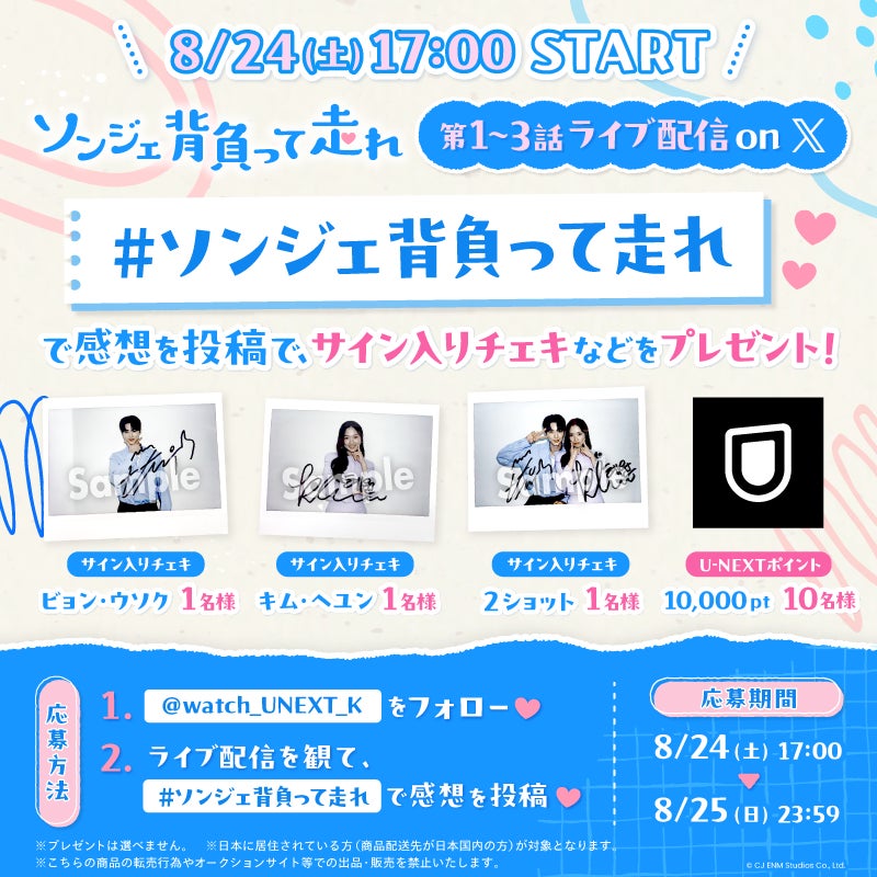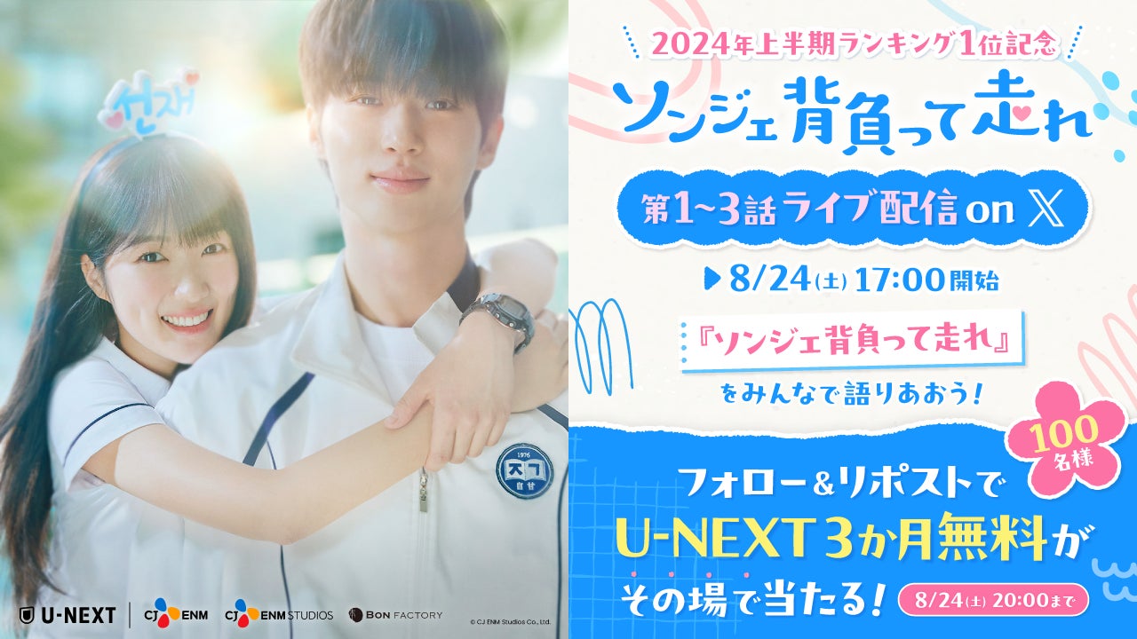 U-NEXTでは、2024年上半期ランキング<韓流・アジア部門>1位記念として、8月24日(土)17時より、「『ソンジェ背負って走れ』第1~3話ライブ配信 on X」を開催いたします。