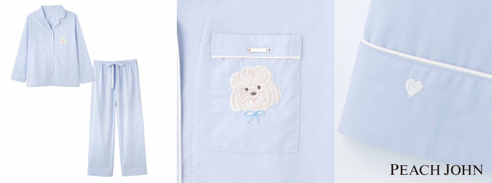 ベースはブルーの無地。胸ポケットにメレンゲクッキー風のわんちゃんの刺しゅう入り。右袖にのみ入るハート刺しゅうもポイント!