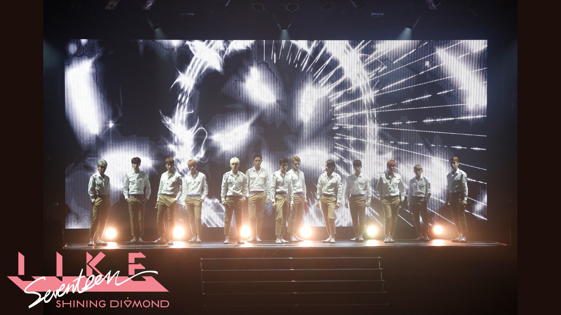 韓国の13人組ボーイズグループ、SEVENTEENが2016年8月に開催した日本初上陸コンサート『2016 ‘LIKE SEVENTEEN - Shining Diamond’ in Japan CONCERT』中野サンプラザ公演。キレのある群舞で冒頭から観客を一気に独自の世界へと引き込んでいき、パフォーマンス、ボーカル、ヒップポップ3つのチームでは、それぞれが違った色合いのステージを披露。個性豊かなボイスでつなぐ歌のリレー、黒い目隠しがインパクトの妖艶なラップなど、多彩なステージングで魅了した。パワフルでクール、それでいてキュートな魅力を合わせ持つSEVENTEENの見どころ満載となる圧巻のコンサート。