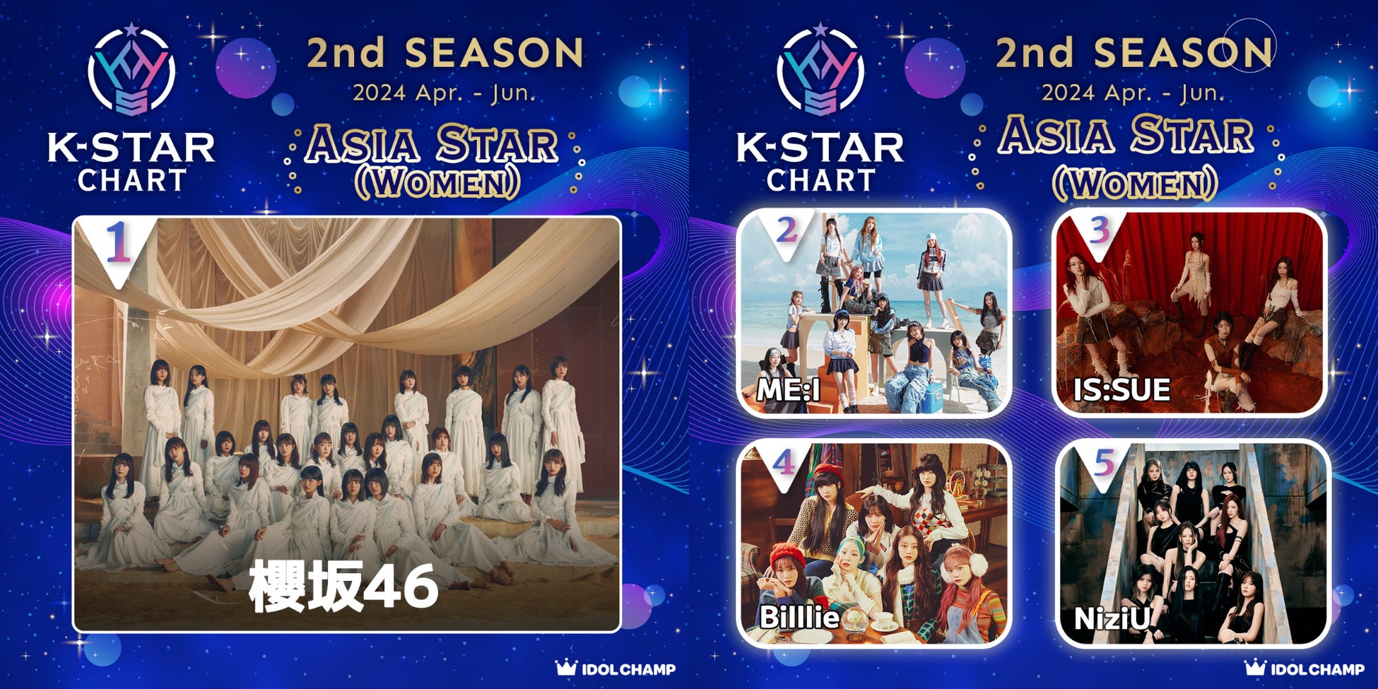 「Asia Star (Women)」1位は、1st Season投票「Asia Star」部門で1位となった櫻坂46が多くのファンからの支持を集めて再び1位を獲得しました。2位には、日本最大級のサバイバルオーディション番組初のガールズ版「PRODUCE 101 JAPAN THE GIRLS」から誕生した注目のガールズグループME:Iが、3位には、ME:Iと同じオーディション番組に出演した4名から新たに結成されたIS:SUEが輝きました。連覇のかかる櫻坂46と、同じ人気オーディション番組から誕生した新グループのME:IとIS:SUEの3組のファンによる熱い応援合戦が繰り広げられました。 4位は日本人メンバー2名が所属するBilllie、5位はNiziUという結果となりました。