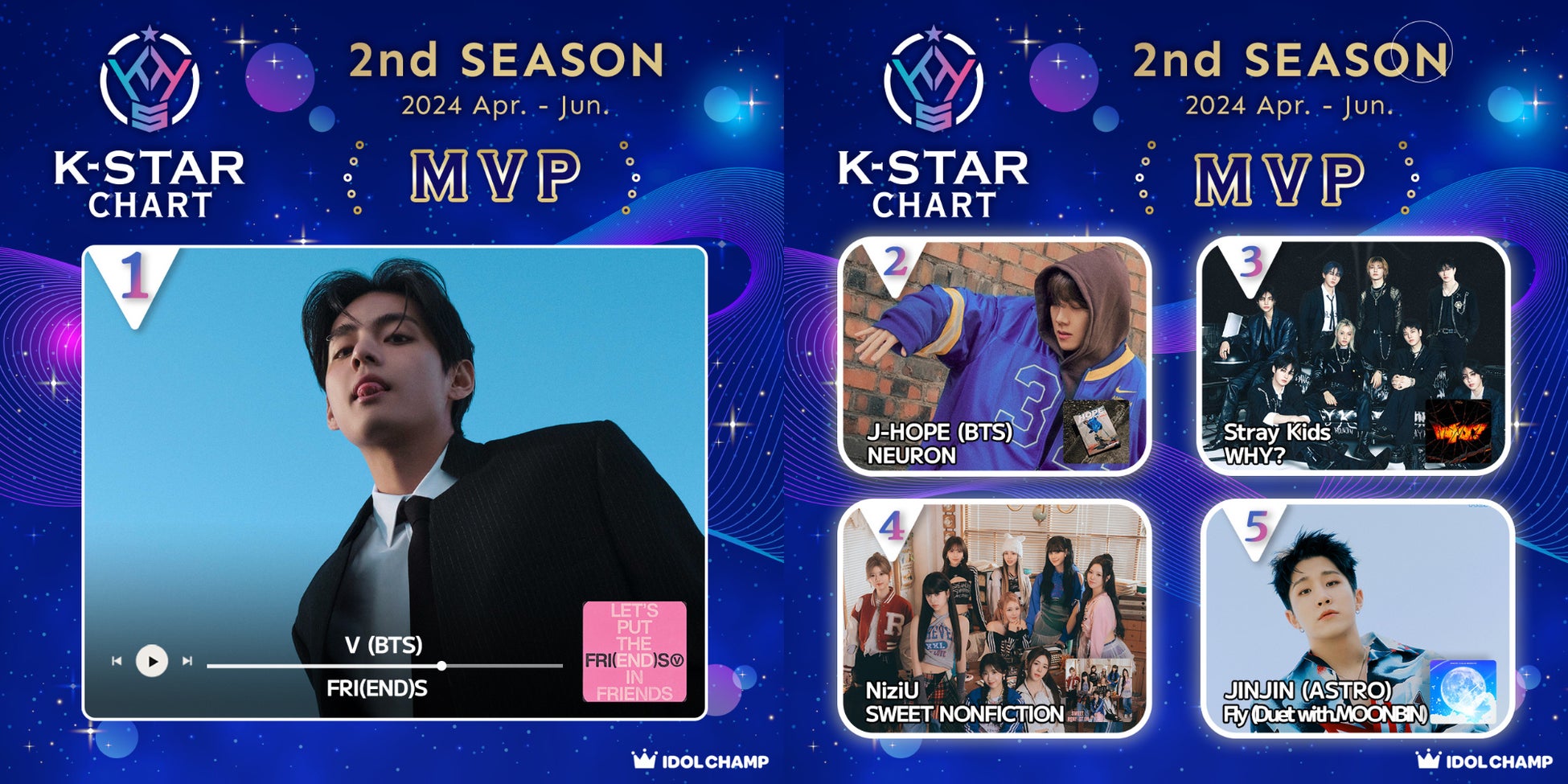 2024年1月よりスタートしたK-STAR CHARTの2024年4月~6月の投票実績を基にした累計ポイント数により決定するシーズンMVPには、3カ月連続月間MVPを獲得したV (BTS) の「FRI(END)S」が輝きました。Vは1st Seasonシーズンチャートにおいても、UMIとのコラボ曲でMVPを獲得しており、アーティストとしては2期連続の受賞となります。