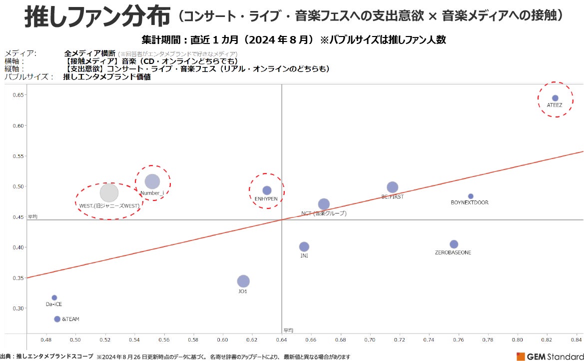右肩上がりの散布図になっていることから、「音楽(CD・オンラインどちらでも)」に接触している割合と、「コンサート・ライブ・音楽フェス」への支出意欲には一定程度の相関関係があると考えられます。先述した「コンサート・ライブ・音楽フェス」への支出意欲が最も高かった『ATEEZ』は、楽曲を通じて接触している推しファンの割合も最も高いことが分かります。また傾向線(赤い線)よりも上側に位置して赤枠で囲っている、『ATEEZ』『ENHYPEN』『Number_i』『WEST.』の4グループは、推しファンが音楽を通じて接する以上にコンサートや音楽フェスなどを通じて直接”会いたい”という意欲が高いグループだと推測されます。
