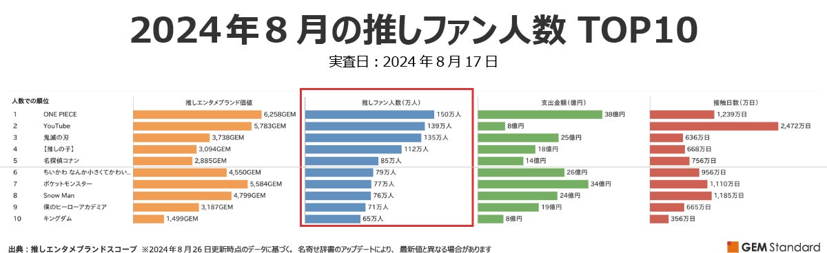 メディアを横断して、推しているファン(=推しファン)が最も多いエンタメブランドはなにか。エンタテイメント業界に向けたデータ×デジタルマーケティングサービスを提供するGEM Partners株式会社(ジェムパートナーズ、所在地:東京都港区、代表取締役:梅津文)では、エンタメビジネスの最大化をサポートする商品「推しエンタメブランドスコープ」で毎月調査を実施しており、最新のエンタメブランド価値を計測することが可能です。今回、2024年8月の最新調査結果のハイライトをお伝えします。