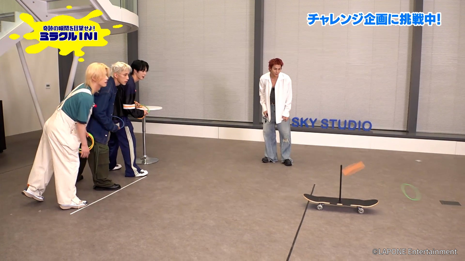 欠席の木村と進行役の西を除いた9名でチーム分けを行い、3チームに分かれたメンバーは「空中シュレッダーチャレンジ」、「フライングハンガー」、「スケボー輪投げ」といった異なる3つの奇跡の瞬間に5分以内に成功できるかチャレンジ。早速コツを掴んだメンバーがコツを周りのメンバーに伝授するなど、全員で難関なお題に全力で取り組みました。