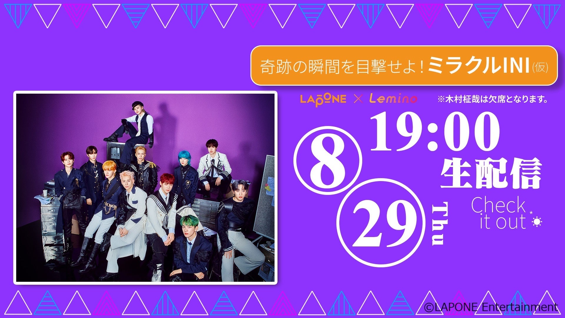 株式会社NTTドコモ(以下、ドコモ)は、映像配信サービス「Lemino®」において7月より始動している、「LAPONE Entertainment」および「LAPONE GIRLS」に所属するアーティストの出演作品が続々集結、配信される「LAPONE×Lemino」における新作オリジナル番組第二弾として、8月29日(木) 19時より「奇跡の瞬間を目撃せよ!ミラクルINI」を生配信いたしました。2021年に華々しくデビューし、今年デビュー3年目を迎えるINI。生配信中にもメンバー同士の団結力が発揮され、お題を見事クリア。SNSでは配信開始早々にトレンド入りを果たしました。