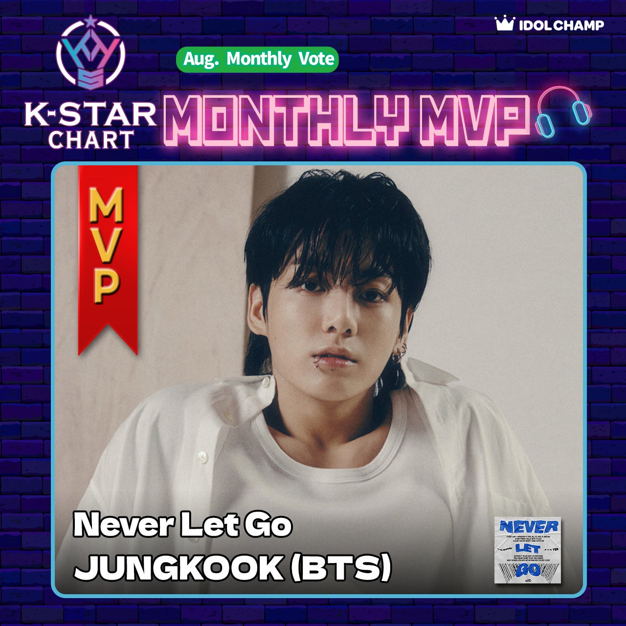 『K-STAR CHART presents POP-K TOP10 Friday』週間チャートの投票数をベースに算出された8月の累計ポイント数で決まる月間チャート1位は JUNGKOOK (BTS)の「Never Let Go」となり、8月のMVPとして番組内で放送されました。先月に続き2ヵ月連続での受賞となります。月間MVPアーティストには「K-STAR CHART」を運営する「K-STAR PROJECT 実行委員会」より、特別な盾をお贈りします。