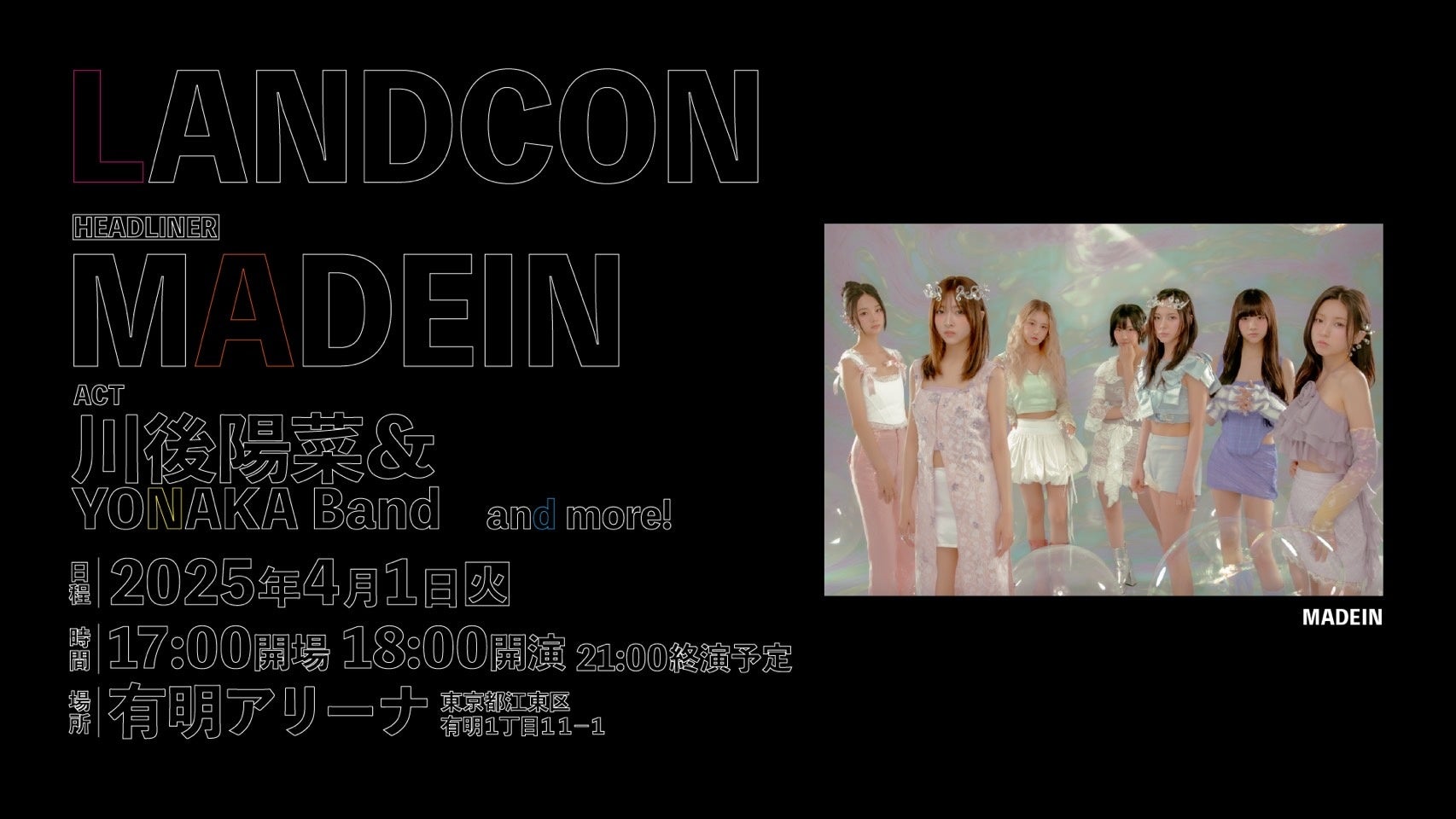 Los Angels、Tokyo、Jakartaを拠点に活動するCreative House "LAND"が主催する音楽・ファッション・カルチャーが融合した複合イベント "LANDCON "。第3回を迎える今回はLAND設立5周年スペシャルイベントになります!イベントのヘッドライナーにはKep1erとして活動したMASHIROとYESSO、LIMELIGHTとして活動したMiU、スヘ、ガウン、そして「PRODUCE 101 JAPAN THE GIRLS」に出演したセリナ、ナゴミの7人で構成され、9月3日にデビューしたMADEINが登場!!