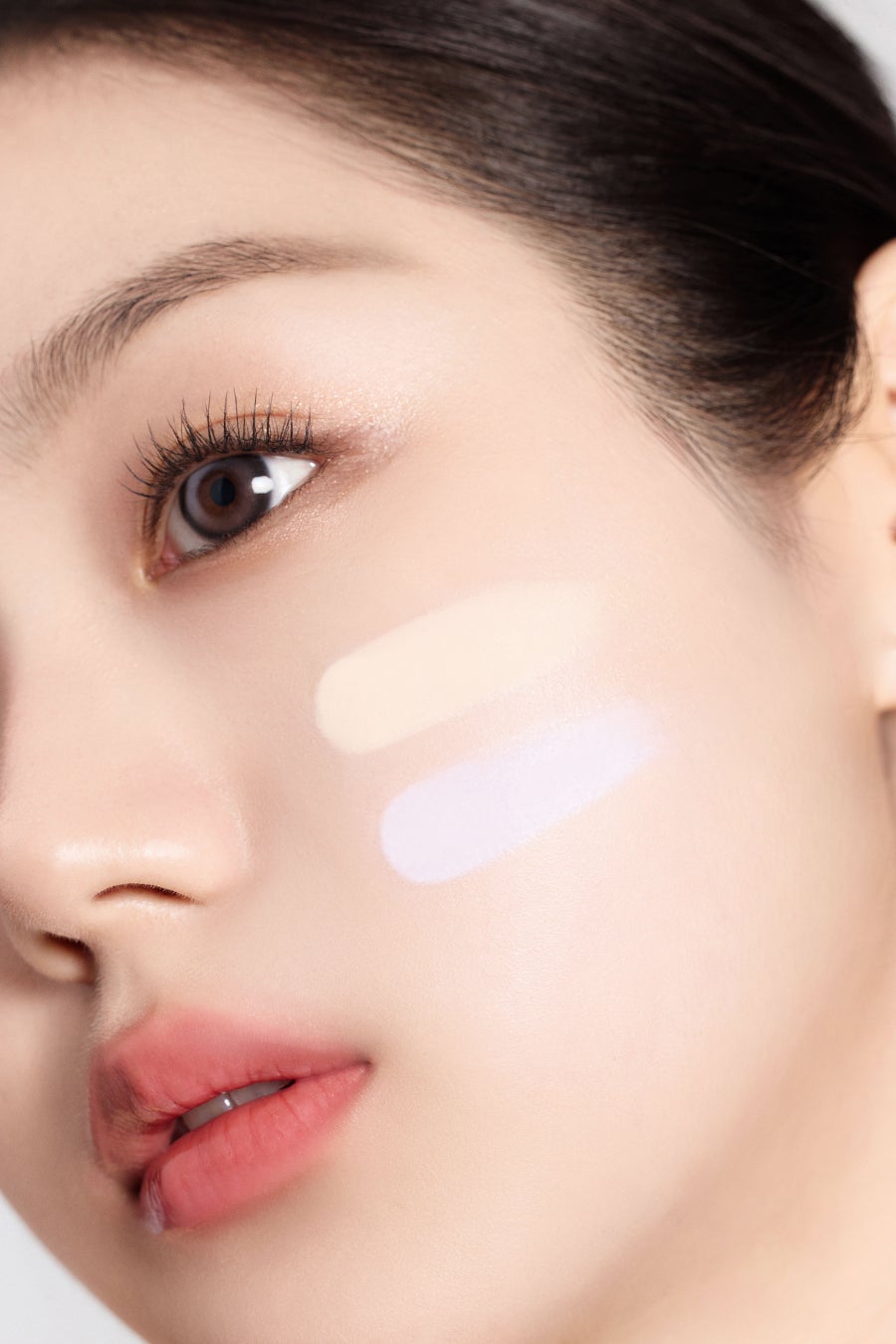 全ての肌トーンの方にオススメなピーチ系のスキンベージュ、黄色みの肌トーンにオススメのピュアラベンダーの2色をご用意。