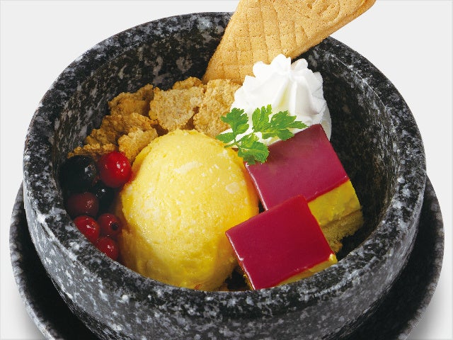 冷たく冷やした石鍋にバニラアイスや安納芋のケーキトッピングを添えました。混ぜ合わせてお召し上がりください。安納芋の優しい味わいとほくほくした甘みをお楽しみいただけます。