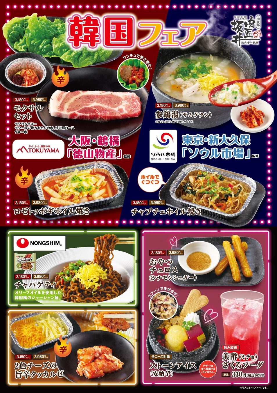 全ての店舗に「肉職人」を配属し、手切りで厳選したこだわりの国産牛の焼肉を、食べ放題で楽しむ「肉匠坂井」では、9月11日(水)より期間限定で「韓国フェア」を開催します。食欲の秋にふさわしい韓国の定番グルメを9種類ご用意させていただきました。また、農心ジャパン様など韓国の味のトレンドを知るメーカー様3社とのコラボメニューも是非、食べ放題でお楽しみください。皆様のご来店をスタッフ一同お待ちしております。