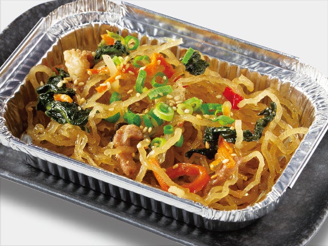 茹でた春雨とコクのある味付けのチャプチェ。醤油をベースにした味付けで、ごま油の風味も加わって、コク旨な韓国風の甘辛炒めです。ホイル焼きで提供いたします。