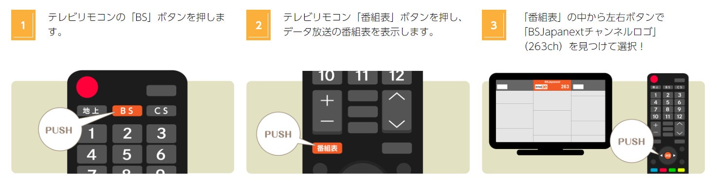 ③「番組表」の中から左右ボタンで 「BSJapanextチャンネルロゴ」(263ch)を見つけて選択