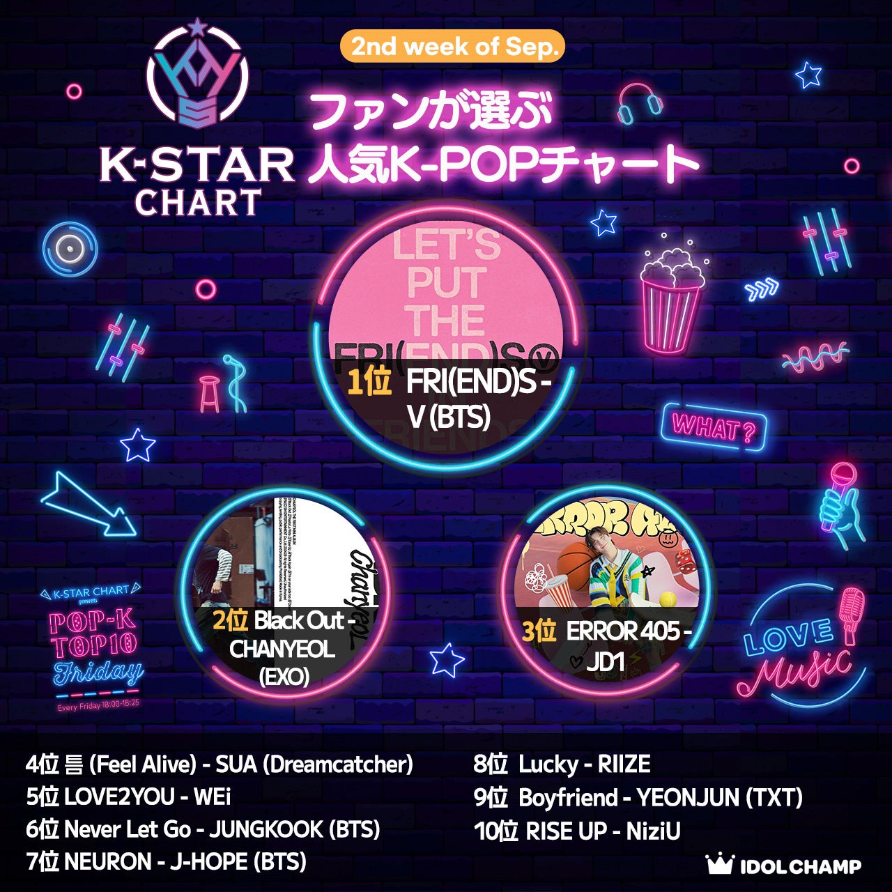 『K-STAR CHART presents POP-K TOP10 Friday』9月13日(金)の放送回において9位にYEONJUN (TOMORROW X TOGETHER)の「Boyfriend」、5位にWEiの「LOVE2YOU」、4位にSUA (Dreamcatcher)の「틈 (Feel Alive)」、2位にCHANYEOL (EXO)の「Black Out」が初登場ランクインし番組内で放送されました。