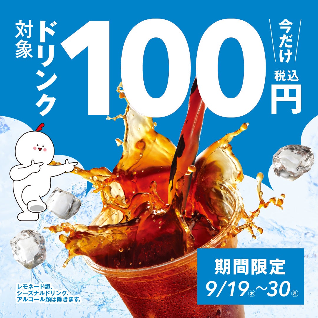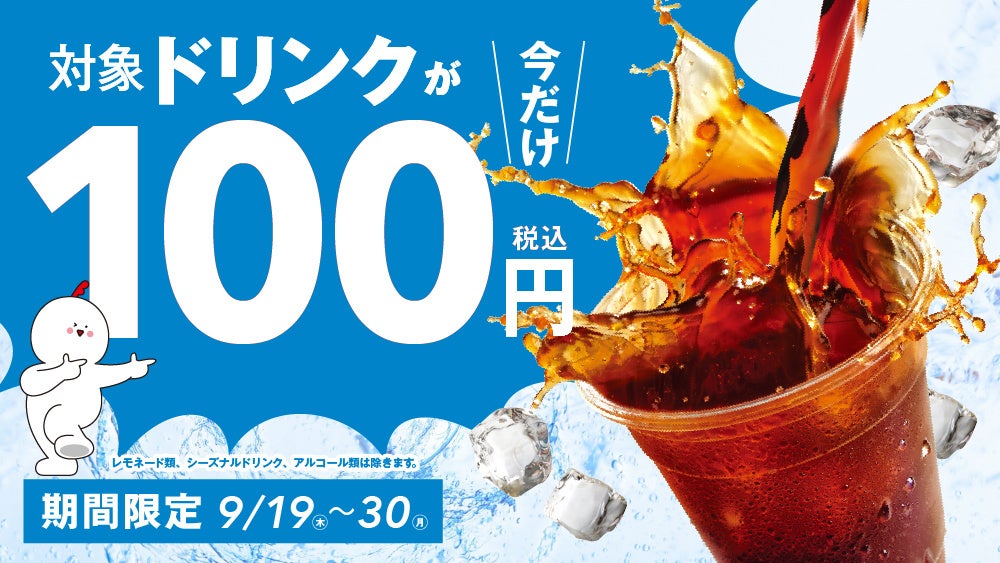 アイスコーヒー、ペプシゼロ、メロンソーダなど、11種のドリンクを対象に、期間中は従来価格290円のドリンクを、190円おトクな100円(税込)で販売するキャンペーンとなります。