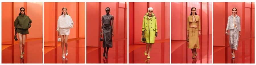 さらに、イラストレーターのヴィットリオ・アッコルネロ・デ・テスタが描いたオリジナルの「フローラ」を用いたスカーフが、ヘッドスカーフとして登場します。ホワイトベースに9つの花束が描かれコントラストカラーで縁取られたオリジナルデザインが、本コレクションのカラーパレットやトーン・オン・トーンによる表現を用いて再解釈されました。