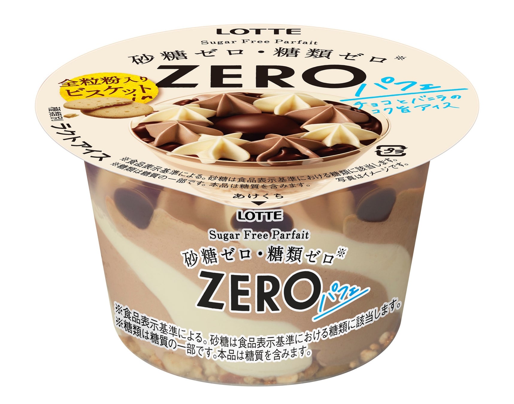 砂糖・糖類ゼロ※なのにバニラとチョコの2種類のアイスを楽しめます。さらに全粒粉入りビスケットとチョコレートが入っているので、食べ応えもあるパフェアイスです。