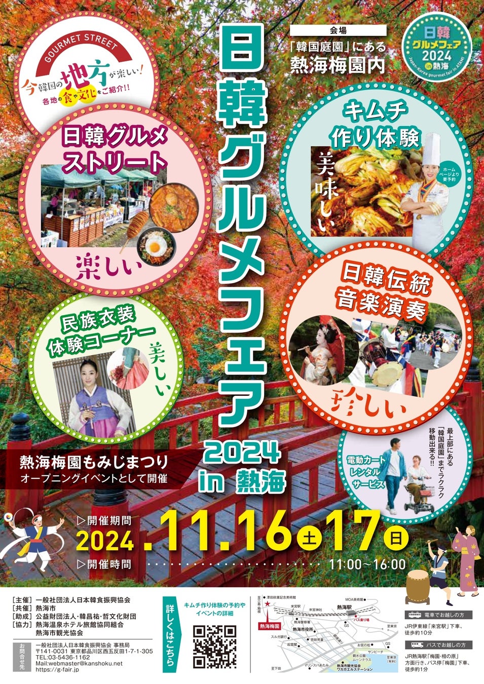 一般社団法人 日本韓食振興協会は、11月16日(土)〜17日(日)に静岡県熱海市と共催で、熱海梅園内の韓国庭園をメイン会場として「日韓グルメフェア2024 in 熱海」を開催します。