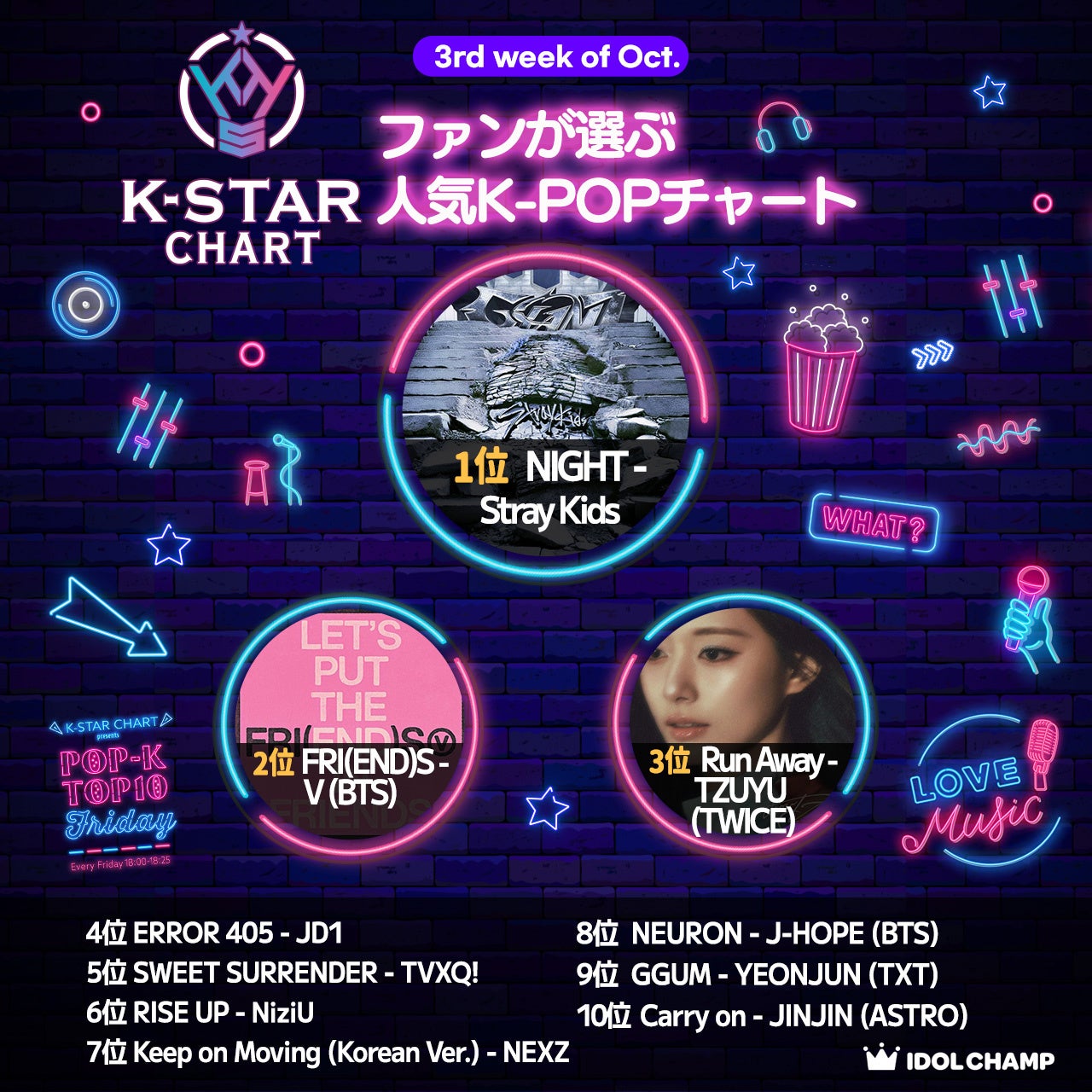 『K-STAR CHART presents POP-K TOP10 Friday』10月18日(金)の放送回においてStray Kidsの「NIGHT」が初登場1位を獲得し、番組内で放送されました。