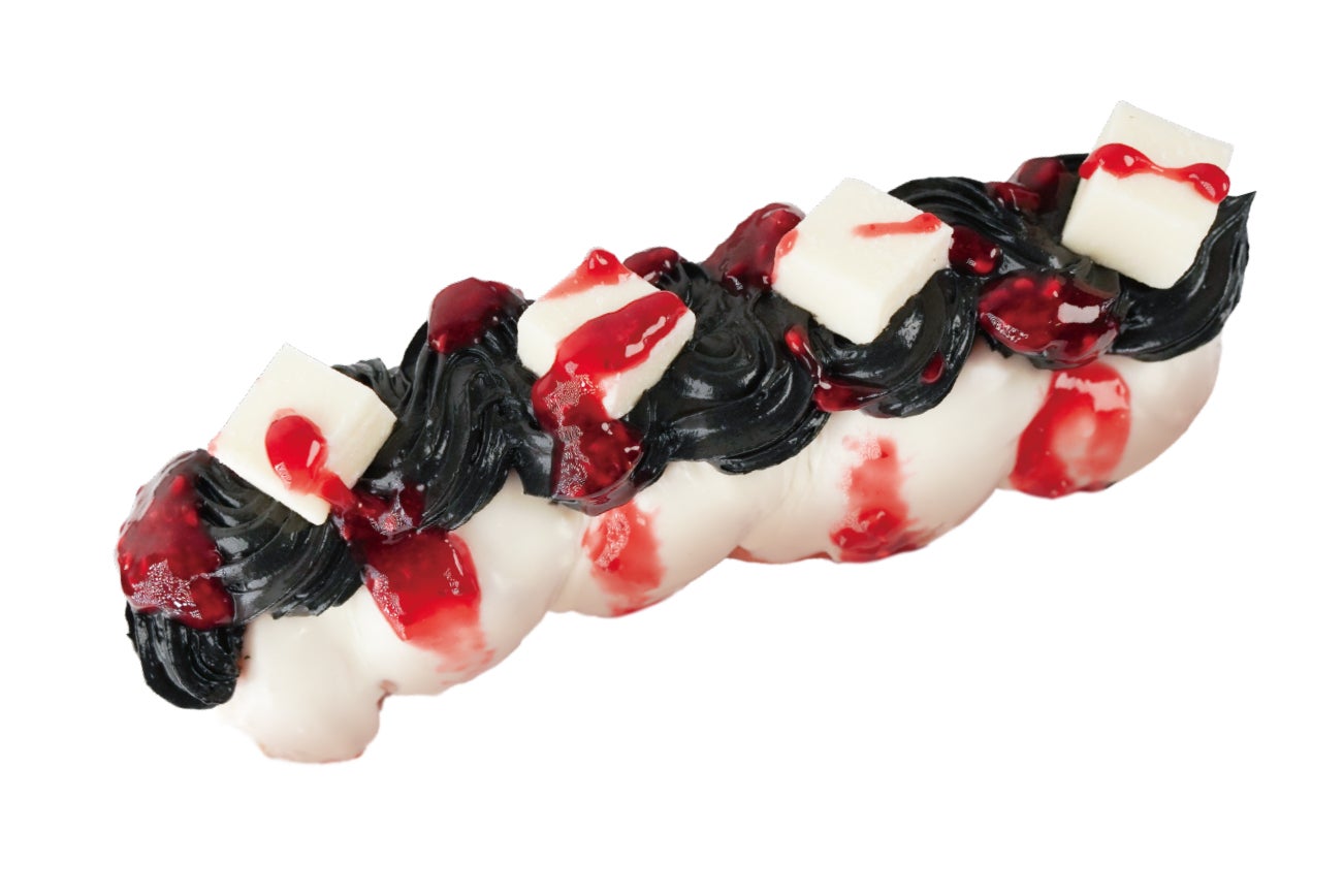 ホワイトチョコレートの上に黒く仕上げたマスカルポーネクリームをトッピング、ストロベリーソースをアクセントに仕上げています。