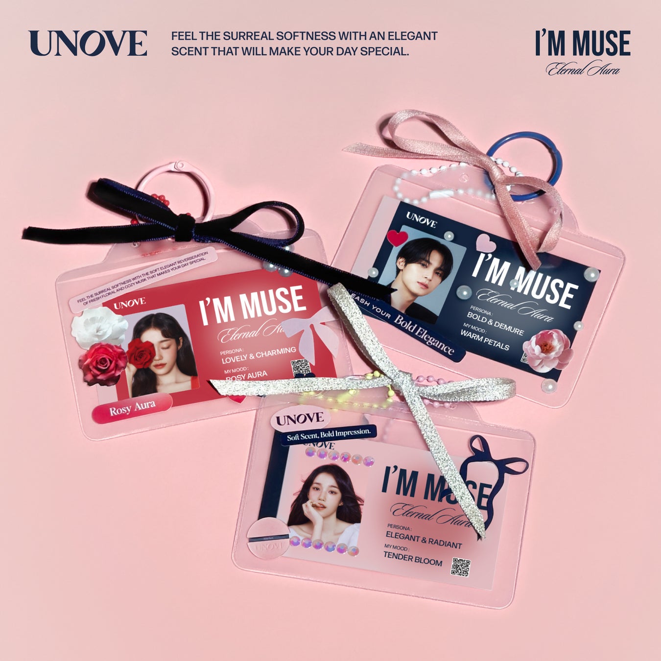 今回公開した新ビジュアルには、「すべての人は自分だけの特別なオーラとエネルギーを持っている」、 「外的な美しさだけでなく、それ以上に香りを通じて個人のもつ魅力とオーラを最大化できる」というUNOVEが考える哲学がコンセプトになっています。映像では、UNOVEの3つのシグネチャーパフューム(ロッジオーラ・ウォームペタル・テンダーブルーム)のコンセプトを、それぞれのグローバルアンバサダー2名の雰囲気と美しさを通じて完璧に表現し、卓越したビジュアルと魅惑的なオーラを放っています。