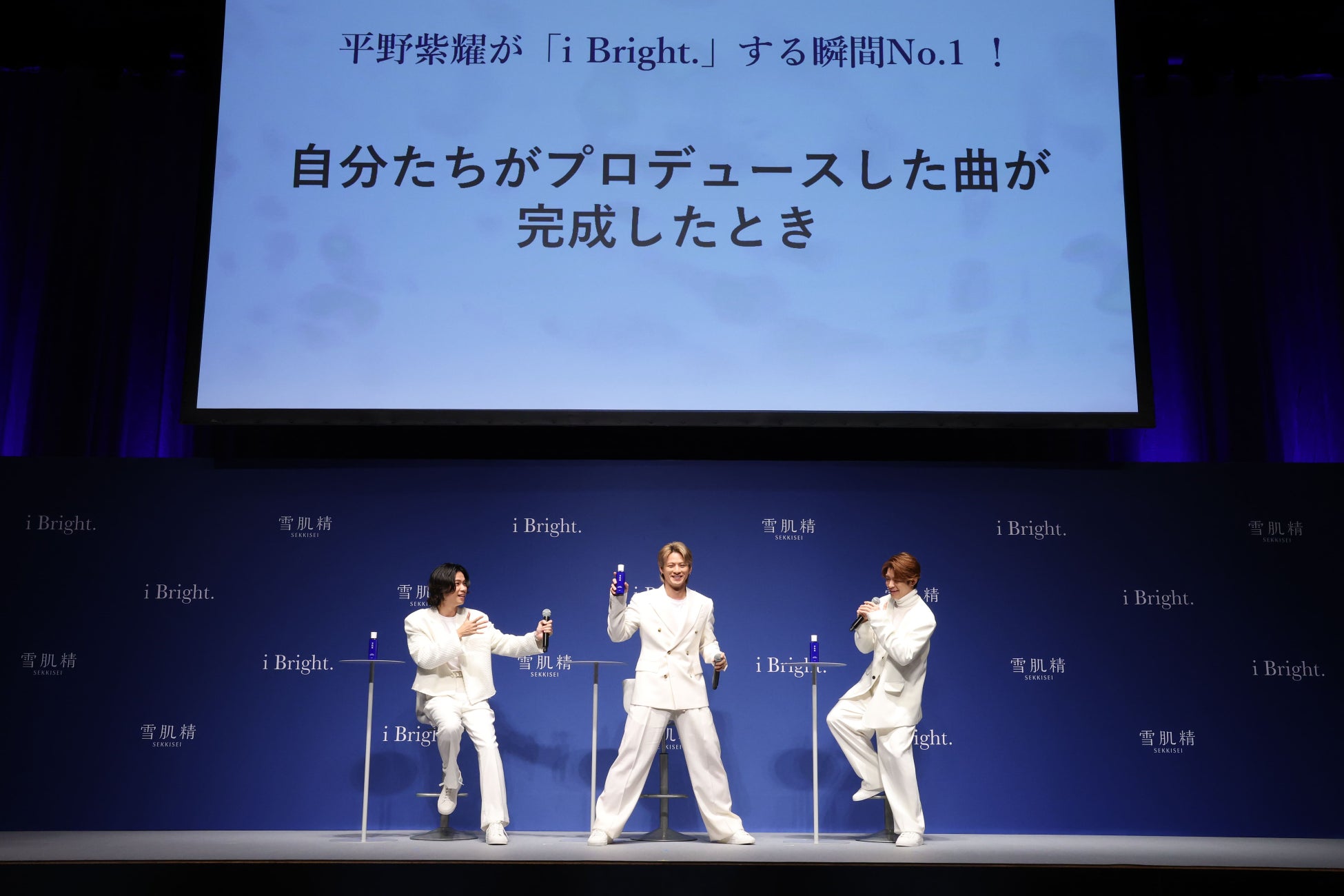 発表会では、最初に、11月7日(木)から全国で順次公開となる新TVCM 『i Bright.-前を向く、この肌に。-』篇が上映され、その息を呑むような美しさに会場が圧倒される中、今回のCMのタイアップ楽曲である『iLY』(1st Full Album「No.Ⅰ」に収録されたNumber_iのプロデュース楽曲)をBGMに、Number_iの3人が透明感あふれるオールホワイトの衣装をまとって、圧巻の輝くオーラでステージへ登場!