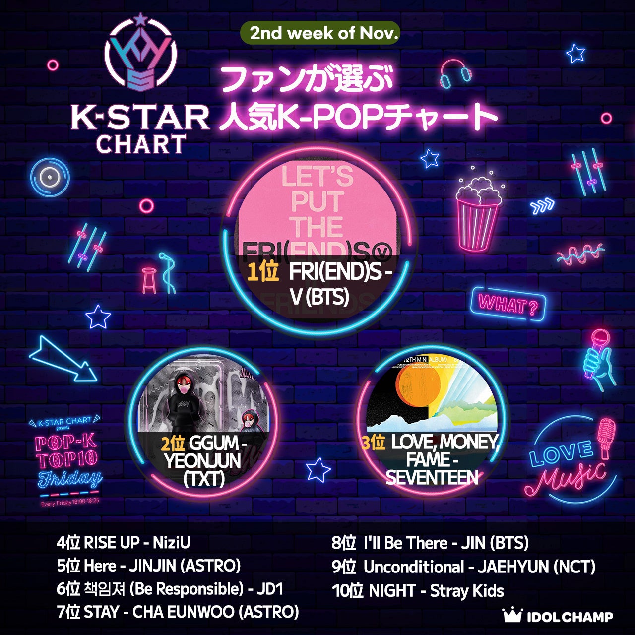 『K-STAR CHART presents POP-K TOP10 Friday』11月8日(金)の放送回においてJAEHYUN(NCT)の「Unconditional」が9位、8位にJIN(BTS)の「I’ll Be There」、5位にJINJIN(ASTRO)の「Here」がチャート投票初登場ランクインしました。