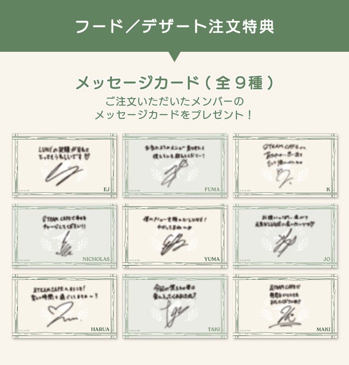 ■フード・デザート注文特典:CAFEでフードまたはデザートメニューをご注文された方にご注文メンバーの「メッセージカード(全9種)」を1品につき1枚プレゼント。