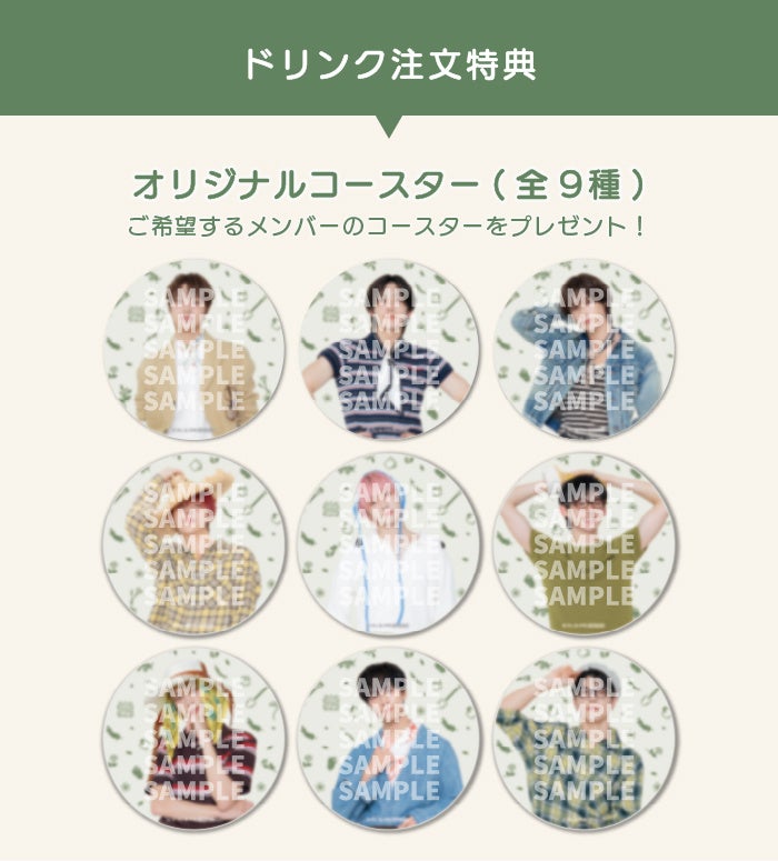 ■ドリンク注文特典:CAFEでドリンクメニューをご注文された方にご希望するメンバーの「オリジナルコースター(全9種)」を1品につき1枚プレゼント。