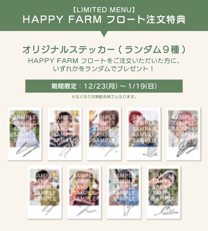■リミテッドメニュー注文特典:CAFEで期間限定の『HAPPY FARM フロート』をご注文された方に「オリジナルステッカー(ランダム9種)」を1品につき1枚プレゼント。※実施期間:2024年12月23日(月)~2025年1月19日(日)