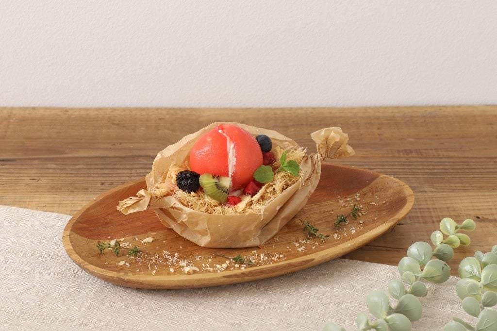 サクサクのカダイフの上にシロップ漬けの桃をのせたパイ。