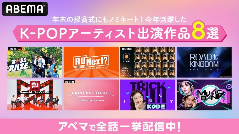 「ABEMA」では、年末に行われる音楽授賞式にもノミネートをされている人気K-POPグループが出演する話題作を全話一挙配信いたします。TWICEのナヨンが出演する新番組『トリックコード』をはじめ、『BOSS RIIZE』、『I-LAND』、『ROAD TO KINGDOM : ACE OF ACE』、『R U Next?』、『SuperMのウィッシュリスト』、『UNIVERSE TICKET』、『ミュージックバンク』の8作品をご紹介いたします。