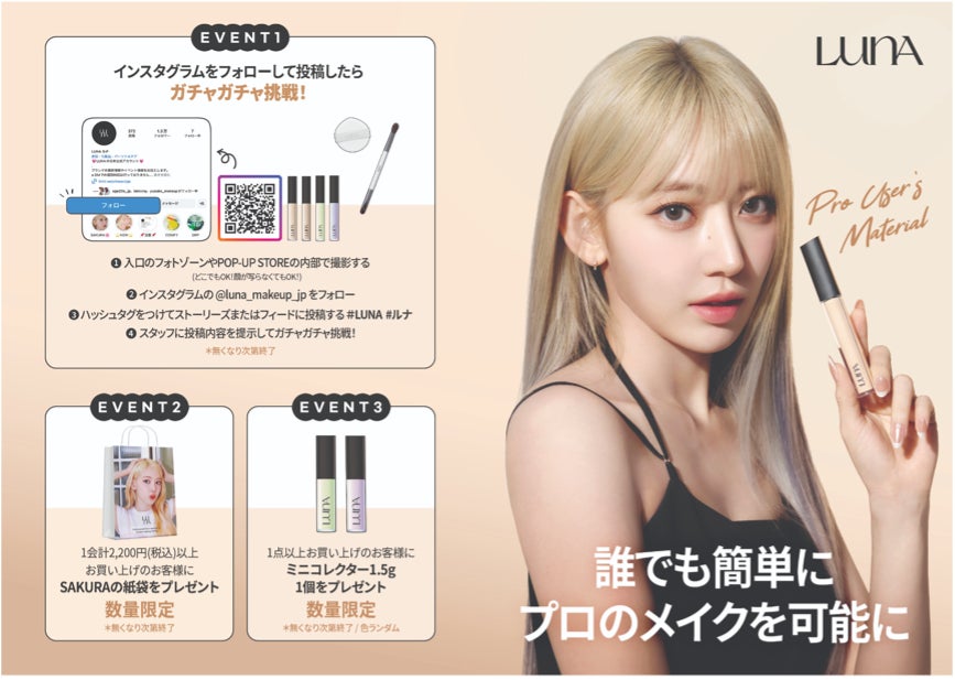 東京開催に引き続き「LUNA with @cosme OSAKA POP-UP STORE」でも、お越しいただいた皆様に特別なミニイベントもご用意しました。SNSフォローやアイテム購入でプレゼントがゲットできるのでぜひご参加ください。