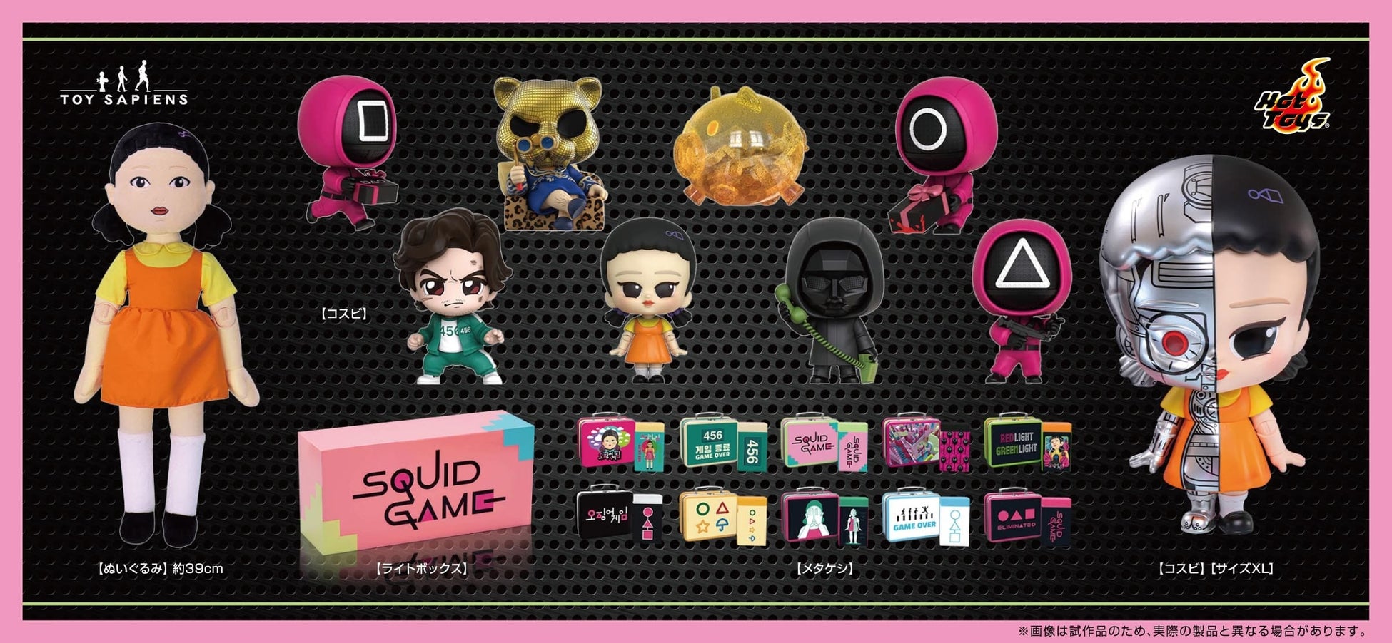 また、ホットトイズお馴染みのライトボックスや、缶ケースと消しゴムがセットになったトイサピエンスのオリジナルアイテム「メタケシ」シリーズにも、「イカゲーム」デザインの新商品が登場。