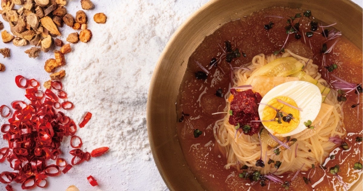 韓国の冷麺では、一般的にそば粉やじゃがいも、さつまいものでんぷんを主に使いますが、釜山の冷麺は小麦の麺。柔らかい麺がスープとよく絡みます。