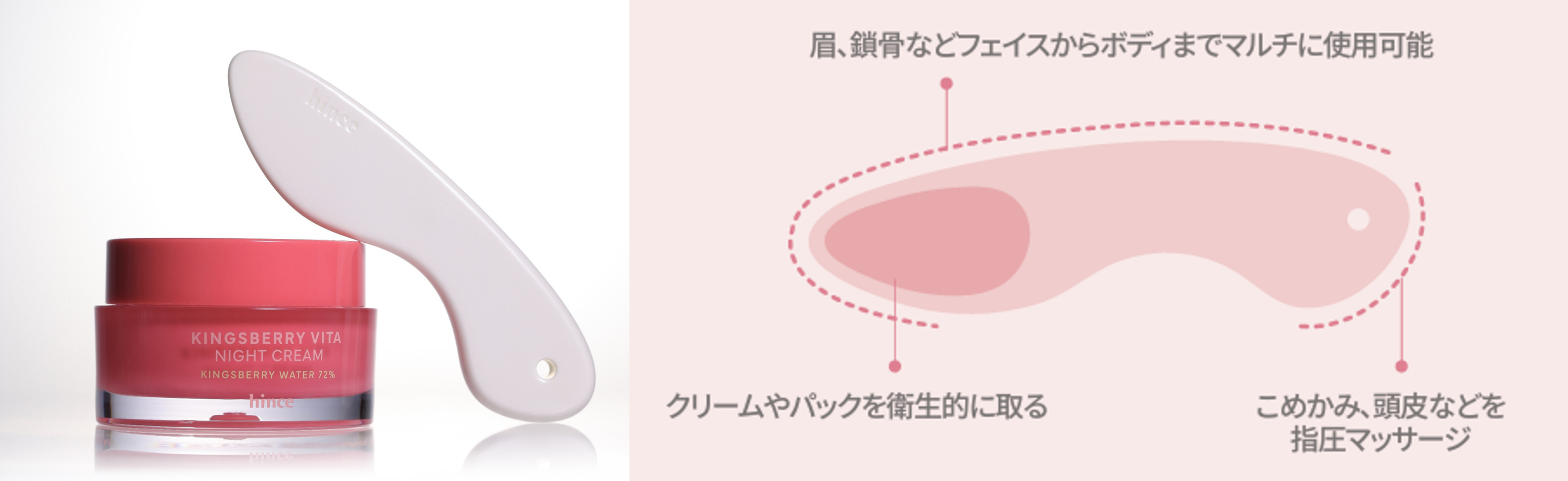 クリームやパックなど基礎化粧品を衛生的に肌にのせることのできるスパチュラと、フェイス&ボディ用のカッサ兼用のスパチュラカッサ。キングスベリービタナイトクリームと一緒に使用して、心地の良いスキンケアタイムをお過ごしください。