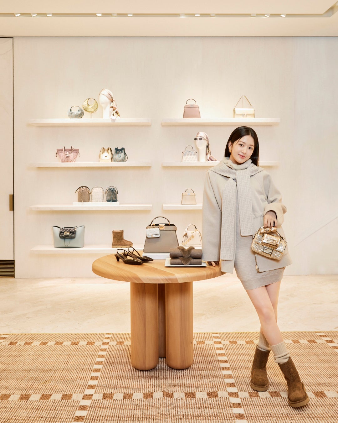 さらにオープニングイベントには、韓国のブランドアンバサダーを務める、K-POPガールズグループ「アイヴ(IVE)」のアン・ユジン(Yu Jin An)が参加しました。フェンディ 2024年ウィンターホリデーコレクションより、首元にファーが施されたニットドレスにパーカスタイルのウールジャケット、足元には全体に「FF」ロゴがあしらわれたローカットのアフタースキーブーツを合わせ、トータルルックを完成させました。さらにキャンディ型の「ソースイートチャーム(So Sweet Charm)」があしらわれたプレイフルな「ナノ バゲット(Nano Baguette)」と全体に同色のスパンコール刺繍が贅沢に施されたシャンパンカラーの「ミニ バゲット(Mini Baguette)」バッグを身に着け、新しいブティックのオープニングを祝福しました。