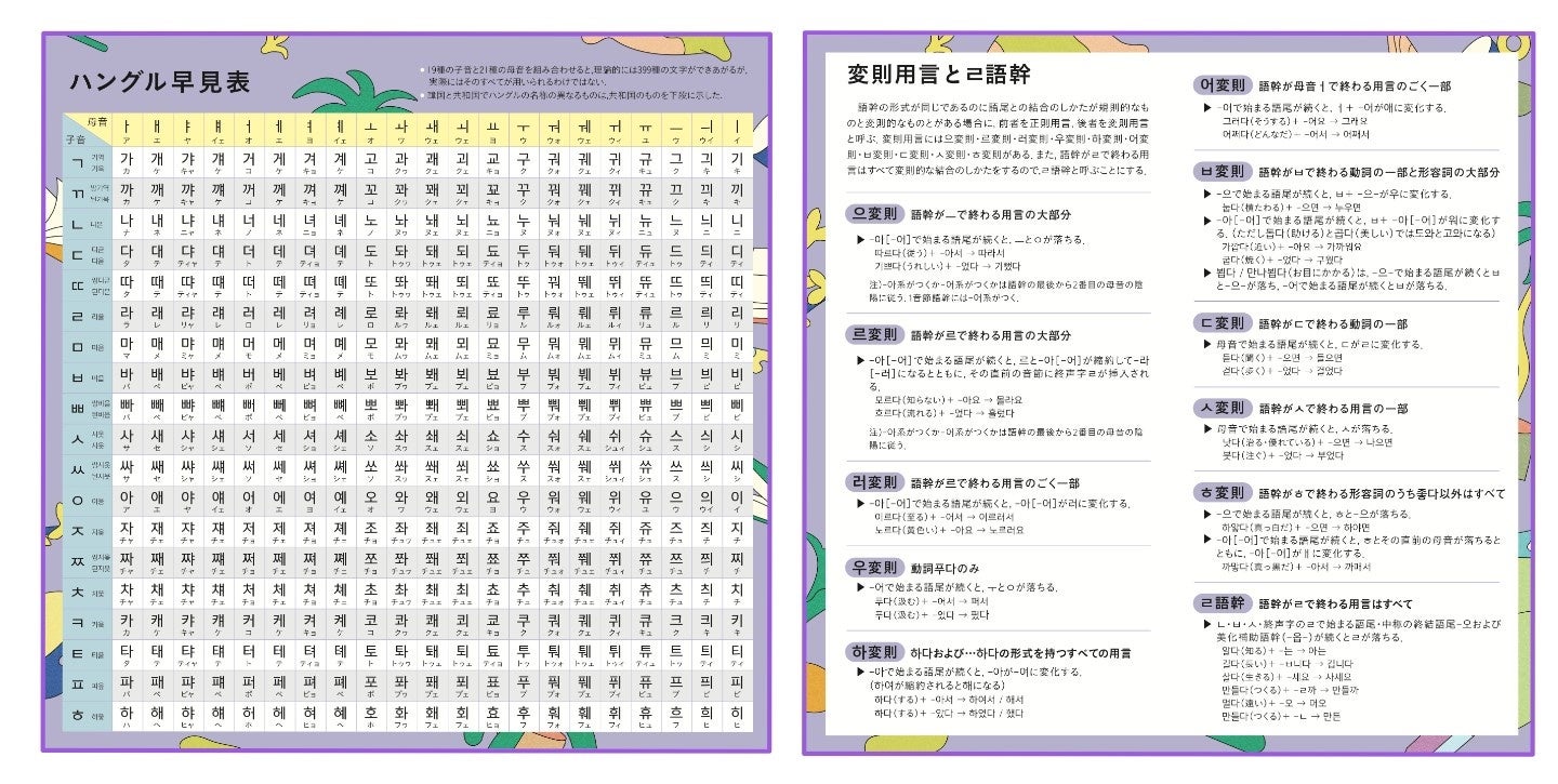 裏側の見返しには変則用言とㄹ語幹の解説があり、困ったときに素早く参照できます。
