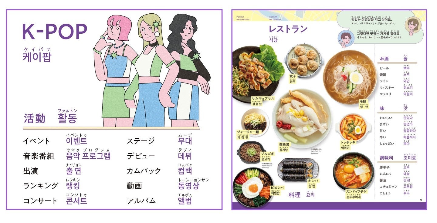 新装版だけの巻頭の「カラー口絵」には、あいさつ、観光地、カフェ、レストラン、美容、K-POP、ドラマ・映画、ショッピングをテーマに、便利な単語やフレーズを掲載しました。また、小学館の辞書公式ウェブサイト「ことばのまど」内のページ(https://kotobanomado.jp/PPK2N)で、ネイティブの発音音声を聞くことができます。