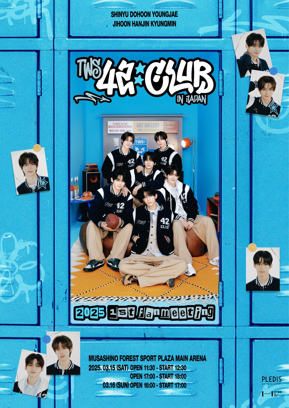 本日、Global Superfan PlatformのWeverseのコミュニティと公式SNSチャンネルに、ファンミーティングのポスターが公開されました。青いキャビネットに設けられた小さな部室の中のTWSの姿が部室に集まった6人のメンバーは「42:CLUB」と書かれたおそろいのジャンパーを着て、ファンと共にする時間を期待するような明るい微笑みを見せています。