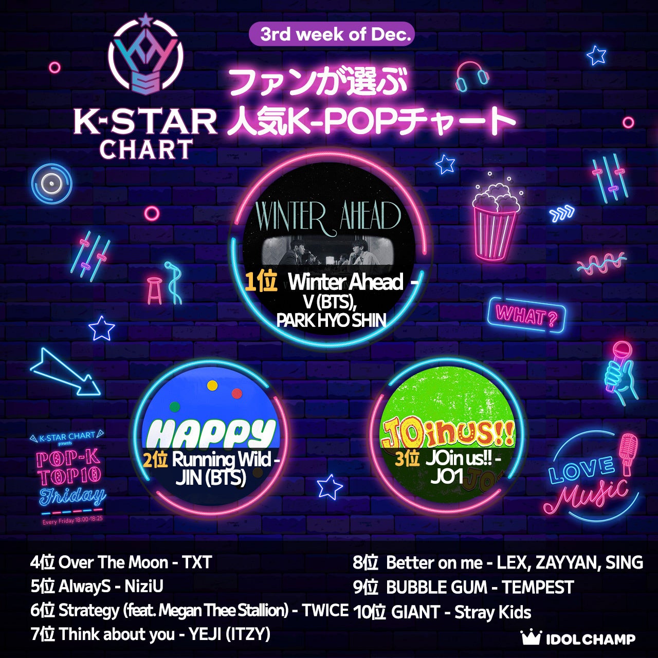 『K-STAR CHART presents POP-K TOP10 Friday』12月19日(金)の放送回において9位にTEMPESTの「BUBBLE GUM」、6位にTWICEの「Strategy(feat.Megan Thee Stallion)」、5位にNiziUの「AlwayS」、3位にJO1の「JOin us!!」が初登場ランクインし番組内で放送されました。