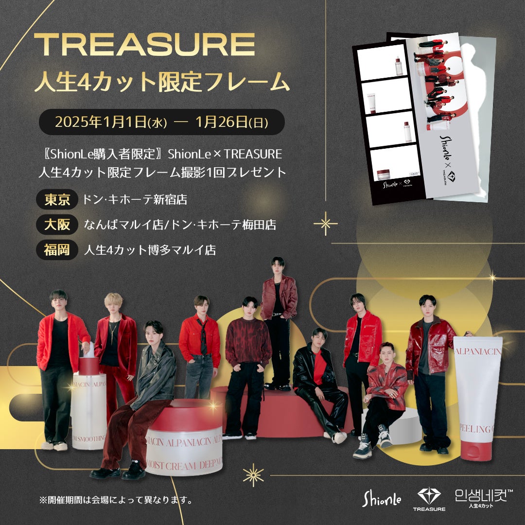 前回、前々回と人気であった購入者特典としてShionLe × TREASURE限定人生4カットフレームがカムバックいたします。新たなビジュアルで公開されたフレームは前回とは異なりTREASUREのクールな一面が伺えます。この「ShionLe×TREASURE購入者特典フレーム」のカムバックを記念し、大阪、名古屋ではPOP-UPも開催。名古屋では初となるPOP-UPに注目と期待が高まります。その他年始に相応しい「HAPPYBAG(福袋)」もShionLe公式Qoo10ショップにて数量限定販売が決定。ますます注目の集まり「ShionLe(ションリ)」に目が離せません!