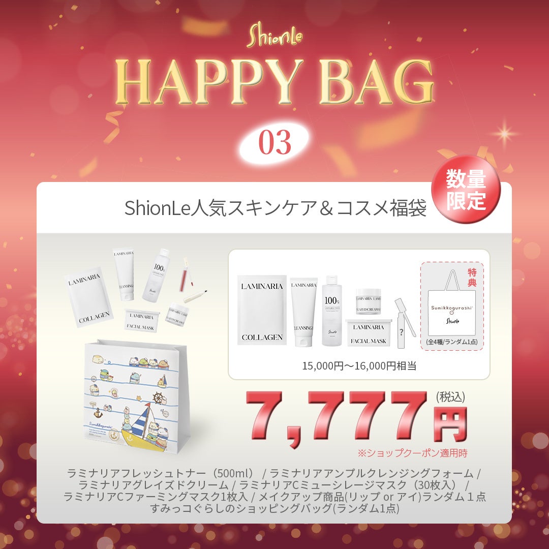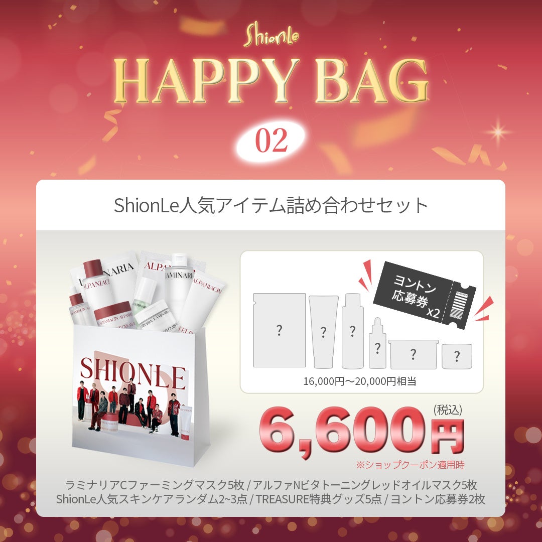 日本の元旦の風物詩と言えば【福袋】といっても過言でないほどあらゆるショップからも展開。2025年元旦よりShionLe公式Qoo10ショップでも数量限定で販売いたします。ここでしか買えない【超豪華!超お買い得!】な商品を詰め込んだ、まさに【HAPPYBAG】ではTREASUREファンも、韓国スキンケアLOVERも楽しめる内容となっております。数量限定の商品となるため、2025年の元旦はQoo10を要CHECK!自分自身へのご褒美やお友だち、家族へのプレゼントとしてもオススメです。