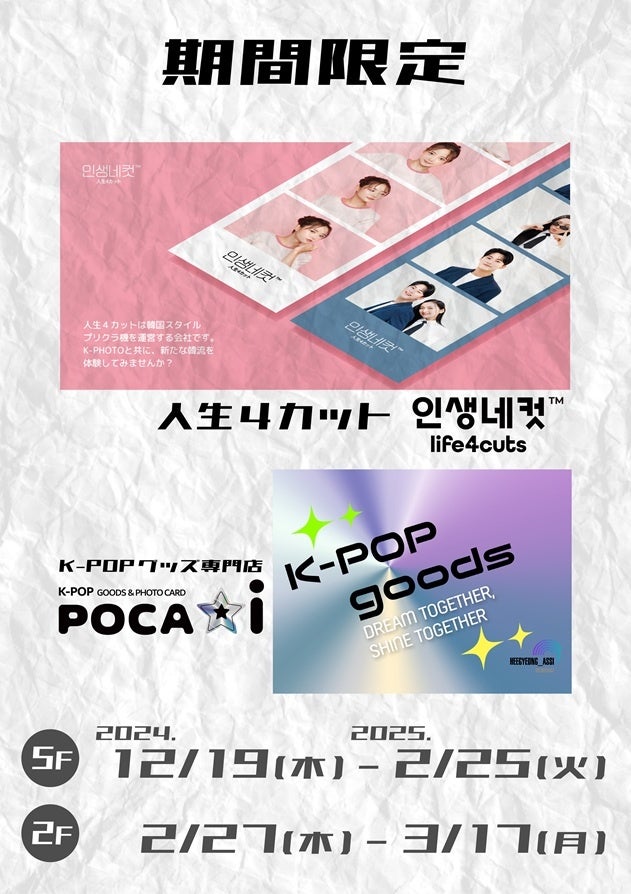 マルイファミリー溝口5Fにて、韓国式プリクラ「人生4カット」とK-POPグッズ専門店「POCA☆i」のコラボポップアップショップを、期間限定で開催中です。丸井では、今回のイベントをはじめ、「一人ひとりの『好き』を応援する」取り組みを拡⼤しております。
